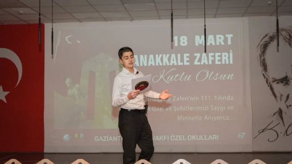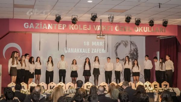 Gaziantep Kolej Vakfı Özel Okulları Konferans Salonunda düzenlenen, GKV Özel Liseleri öğrencilerinin hazırladığı “18 Mart Çanakkale Zaferi ve Şehitleri Anma Günü” töreni, Mütevelli ve Yönetim Kurulu Başkanı Sayın Esra İbanoğlu, Mütevelli ve Yönetim Kurulu Üyeleri, Gaziantep Kolej Vakfı Özel Okulları Genel Müdürü Sayın Fevzi Gürsel, idarecilerimiz, öğretmenlerimiz, öğrencilerimiz ve velilerimizin katılımı ile gerçekleşti.