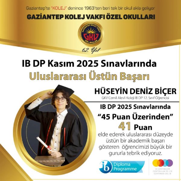Uluslararası Bakalorya (IB) Diploma Programı Kasım 2025 sınavlarında 45 puan üzerinden 41 puan elde ederek uluslararası düzeyde üstün bir akademik başarı gösteren GKV Cemil Alevli Koleji IBDP öğrencimiz Hüseyin Deniz Biçer’i büyük bir gururla tebrik ediyoruz.