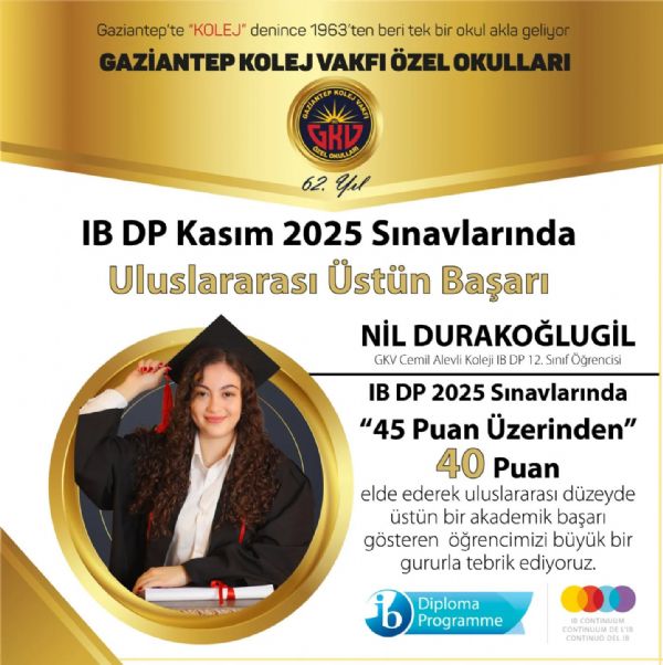 Uluslararası Bakalorya (IB) Diploma Programı Kasım 2025 sınavlarında 45 puan üzerinden 40 puan elde ederek uluslararası düzeyde üstün bir akademik başarı gösteren GKV Cemil Alevli Koleji IBDP öğrencimiz Nil Durakoğlugil'i büyük bir gururla tebrik ediyoruz.