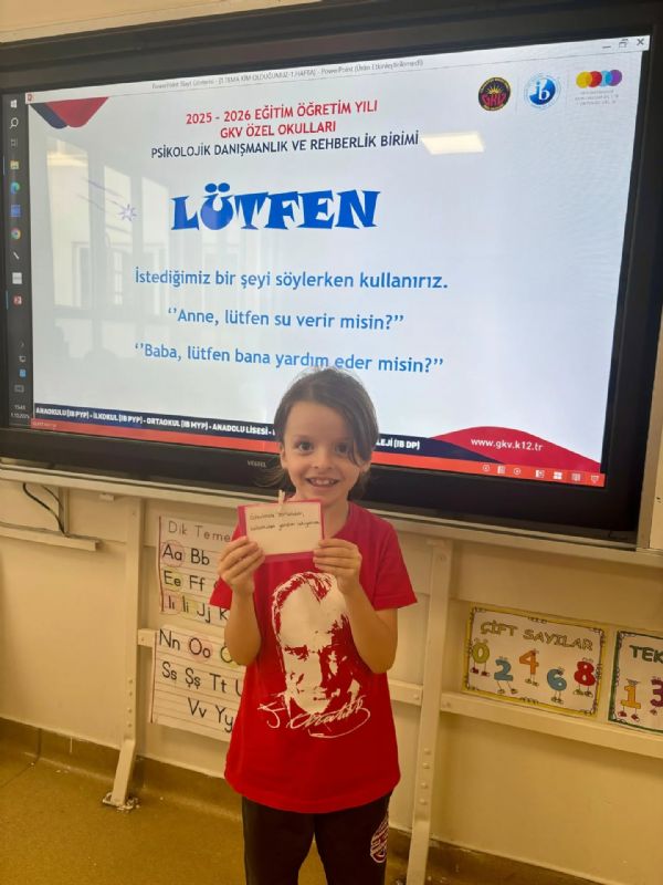 GKV Özel İlkokulu Rehberlik Birimi tarafından 2. sınıf öğrencileriyle yapılan rehberlik dersinde aile içi iletişim ve nezaket sözcüklerinin önemi ele alındı. Derste “lütfen”, “teşekkür ederim”, “rica ederim” ve “özür dilerim” gibi sihirli kelimeler tanıtıldı ve bu kelimelerin iletişimi nasıl olumlu etkilediği örneklerle gösterildi. Öğrencilerle aile içinde saygılı, anlayışlı ve sevgi dolu bir iletişimin ilişkileri güçlendirdiği üzerine etkinlikler yapıldı. Öğrencilerin bu nezaket sözcüklerini günlük yaşamlarında ve aile içi iletişimlerinde aktif olarak kullanmaları amaçlanmıştır.
