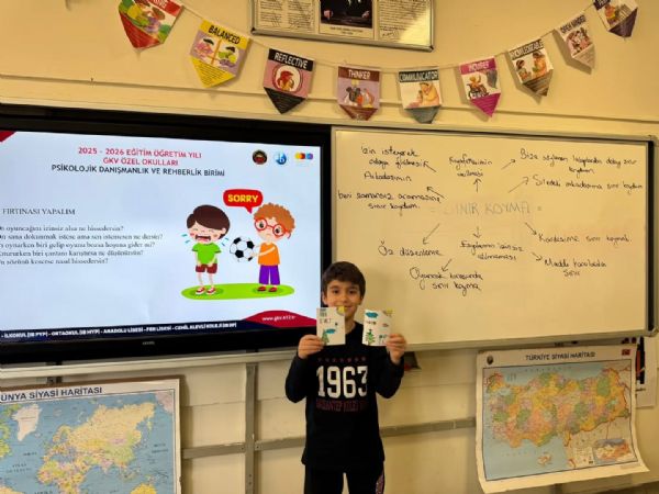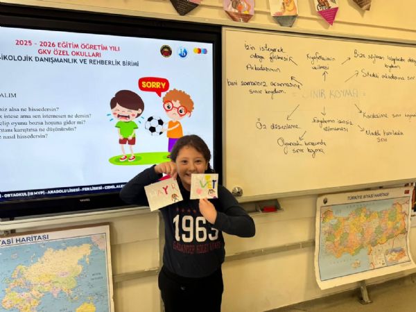 Gaziantep Kolej Vakfı Özel İlkokulu Rehberlik ve Psikolojik Danışmanlık Birimimiz tarafından 3. Sınıf öğrencilerimiz ile duygu yönetimlerini desteklemek, sağlıklı arkadaşlık ilişkileri kurabilmeleri ve başkalarının sınırlarına saygı duyabilmelerini sağlamak amacıyla “Sınır Koymak” konulu sınıf içi rehberlik etkinliği düzenlendi. Öğrencilerimiz kendi Evet-Hayır kartlarını hazırlayarak kişisel alanların güvenliğini sağlama ve güvenli bir iletişimi ortamı hazırlamada “Hayır” diyebilmenin önemini kavradılar. Örnek olaylar üzerinden, oluşturdukları kartları kullanarak fikirlerini arkadaşları ile paylaştılar.