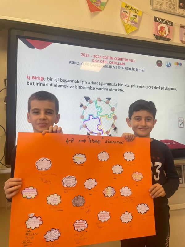 Gaziantep Kolej Vakfı Özel İlkokulu Rehberlik ve Psikolojik Danışmanlık Birimimiz tarafından 4.sınıf öğrencilerimize yönelik “İş Birliği” konulu sınıf rehberlik dersleri gerçekleştirildi. Birlikte üretmenin yaratıcılığı nasıl arttırdığı ve farklı düşüncelere saygı duymanın bizi nasıl zenginleştirdiği konu başlıkları üzerinde duruldu. Öğrencilerimizin iletişim becerilerini güçlendirmek, farklı düşüncelere saygı duymalarını desteklemek ve iş birliği kültürünü geliştirmek amacıyla “Sınıf İş Birliği” sözleşmesi hazırlandı. Öğrenciler bu sözleşme ile ortak karar almanın sınıf ortamına katkısını keşfettiler.