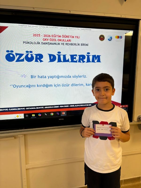 GKV Özel İlkokulu Rehberlik Birimi tarafından 2. sınıf öğrencileriyle yapılan rehberlik dersinde aile içi iletişim ve nezaket sözcüklerinin önemi ele alındı. Derste “lütfen”, “teşekkür ederim”, “rica ederim” ve “özür dilerim” gibi sihirli kelimeler tanıtıldı ve bu kelimelerin iletişimi nasıl olumlu etkilediği örneklerle gösterildi. Öğrencilerle aile içinde saygılı, anlayışlı ve sevgi dolu bir iletişimin ilişkileri güçlendirdiği üzerine etkinlikler yapıldı. Öğrencilerin bu nezaket sözcüklerini günlük yaşamlarında ve aile içi iletişimlerinde aktif olarak kullanmaları amaçlanmıştır.