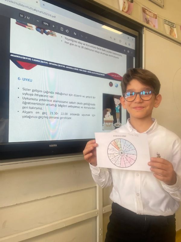 GKV Özel İlkokulu Rehberlik Birimi tarafından 4.sınıf öğrencilerimize "Etkili Ders Çalışma" konulu sınıf içi rehberlik etkinliği düzenlendi. Bu etkinlikle sağlıklı beslenme, yeterli uyku süresi, ek çalışma, ödevleri erken saatlerde yapma, kitap okuma, ekran süresi, planlı olma konu başlıkları ele alındı. "Zaman Çarkı" öğrenme deneyimi ile öğrencilerimiz zaman yönetimi konusunu somutlaştırdılar. Öğrencilerimizin öğrenme süreçlerine yönelik farkındalık kazanarak kendi öğrenme sorumluluklarını almaları hedeflendi.